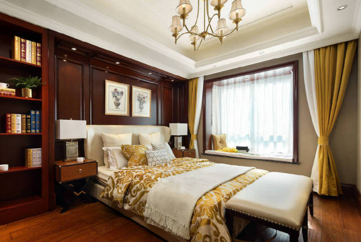 浅色系的背景色保证整个空间不会过于压抑,主体色就可以采用复古色了。美式家具多为褐色和棕色,搭配相近色的地板,复古气息满满,兼具浓郁的历史文化感。